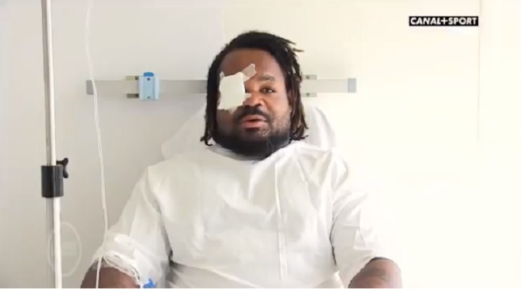 On le voit assis sur un lit d’hôpital avec un gros pansement à l’œil droit.