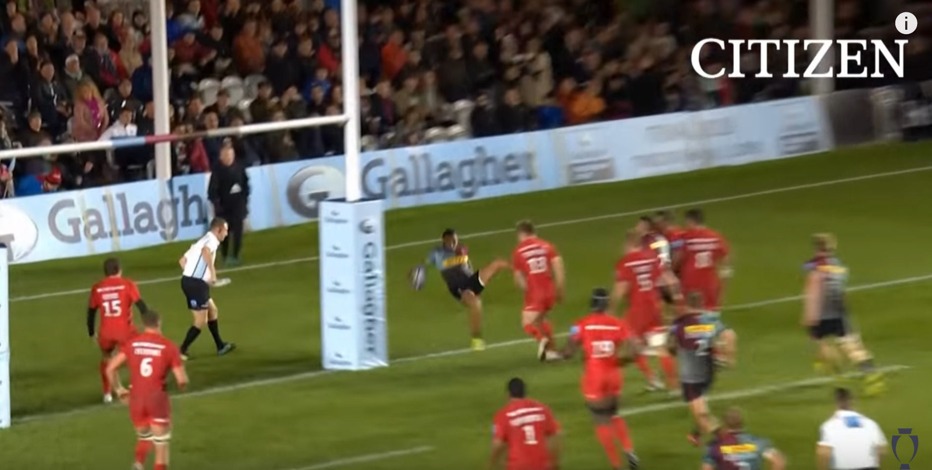 On a l’habitude quelques fois par saison de voir des essais marqués suite à une pénalité, lorsque le ballon frappe le poteau ! Mais ici, ce n’est même pas le cas, la pénalité ressemble en fait à une passe au pied !